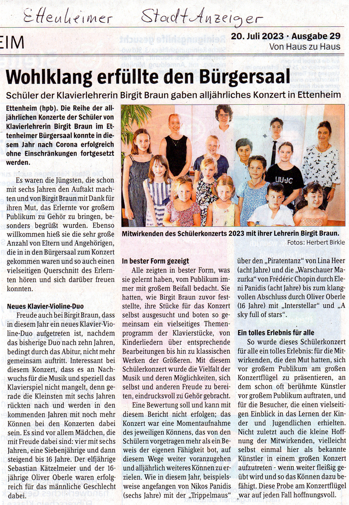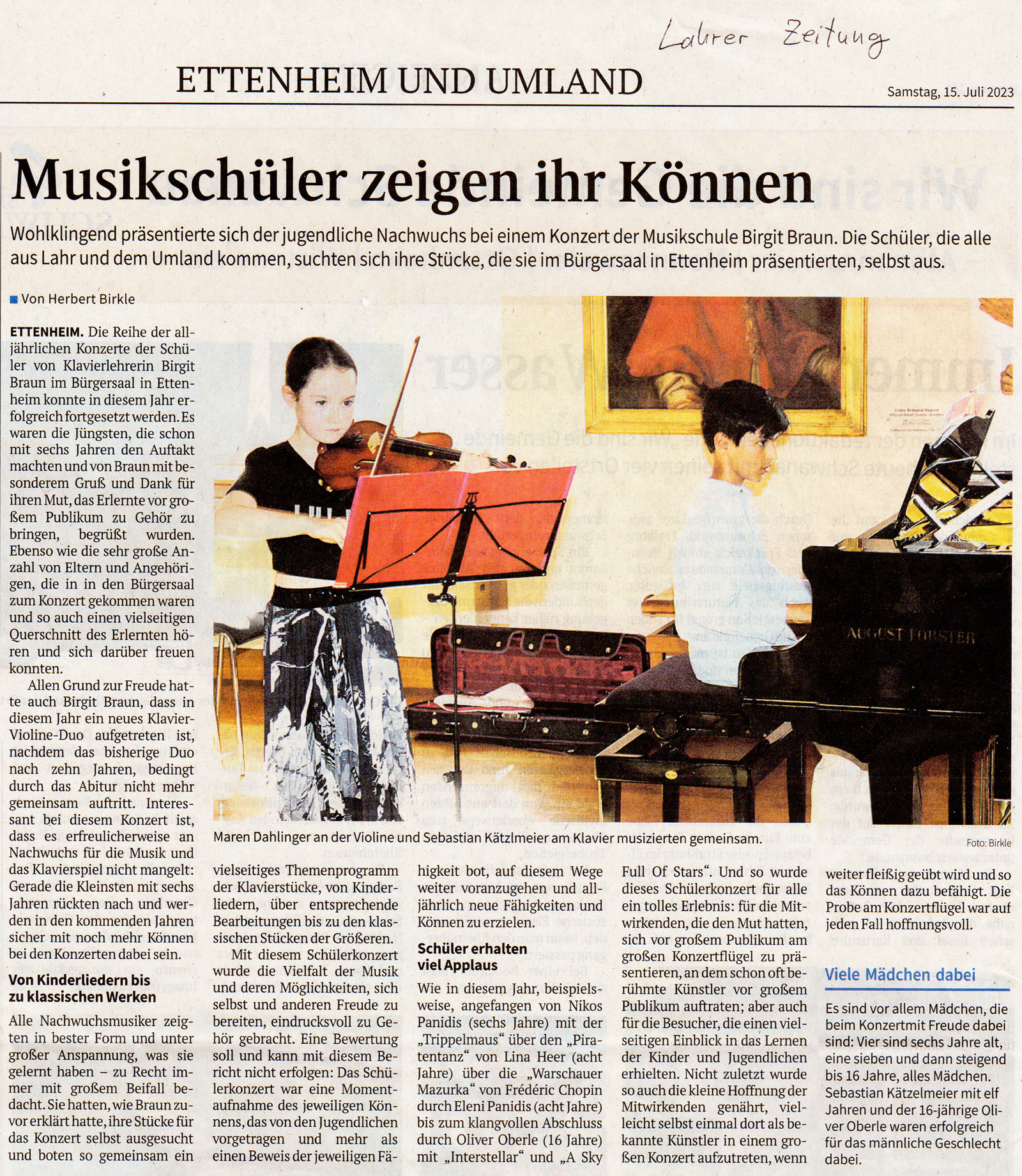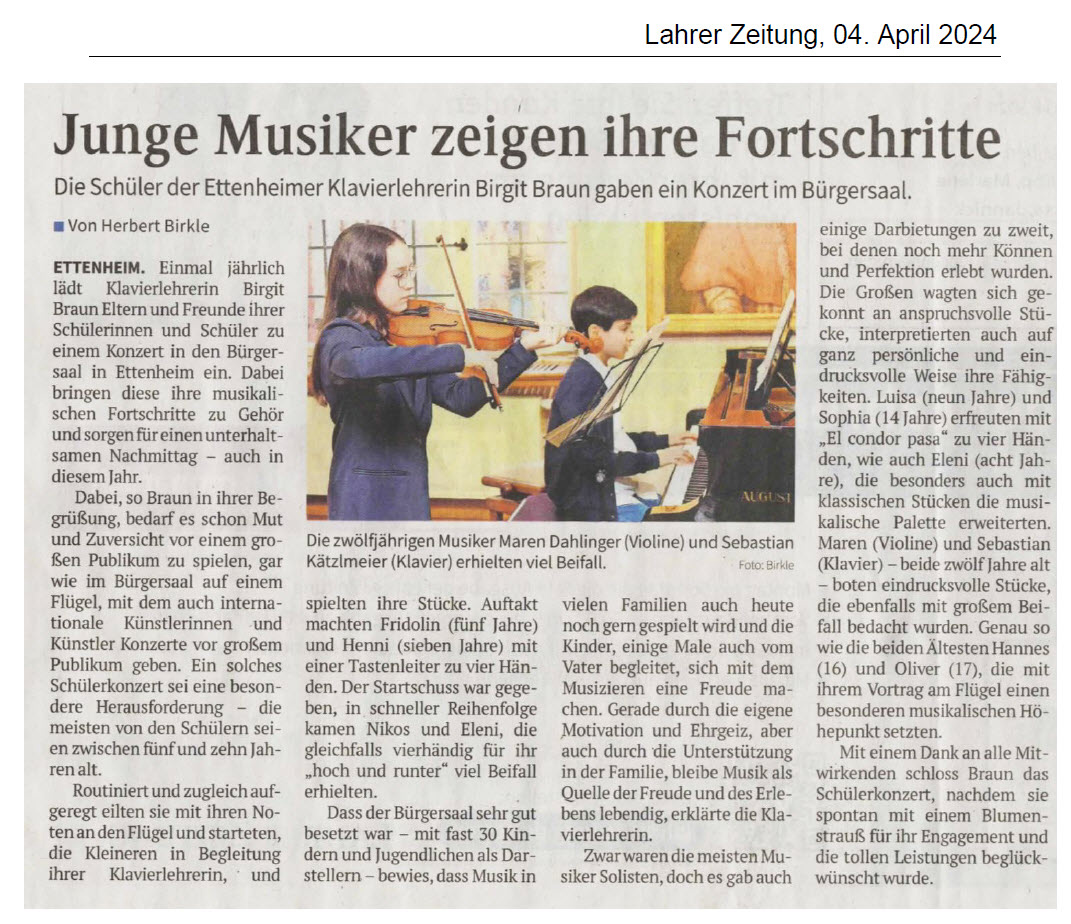 Zur schönen Tradition ist das von mir organisierte Vorspiel einmal im Jahr in Ettenheim im Bürgersaal des Rathauses geworden. Fast alle meine Klavierschüler nutzen diesen Tag, um erlernte Stücke vor Familie und Publikum zu präsentieren. Auch Klavier-Violin-Duos finden sich immer wieder und bereichern die Aufführung. Das nächste Vorspiel findet am 31. Mai 2025 um 17:00 Uhr statt.