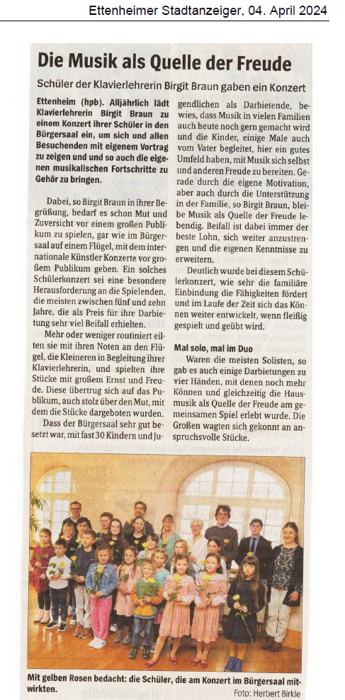 Was ist Klavierspielen ohne Auftritt. Wer möchte, kann am jährlichen Vorspiel in Ettenheim im Bürgersaal des Rathauses vor Publikum teilnehmen.